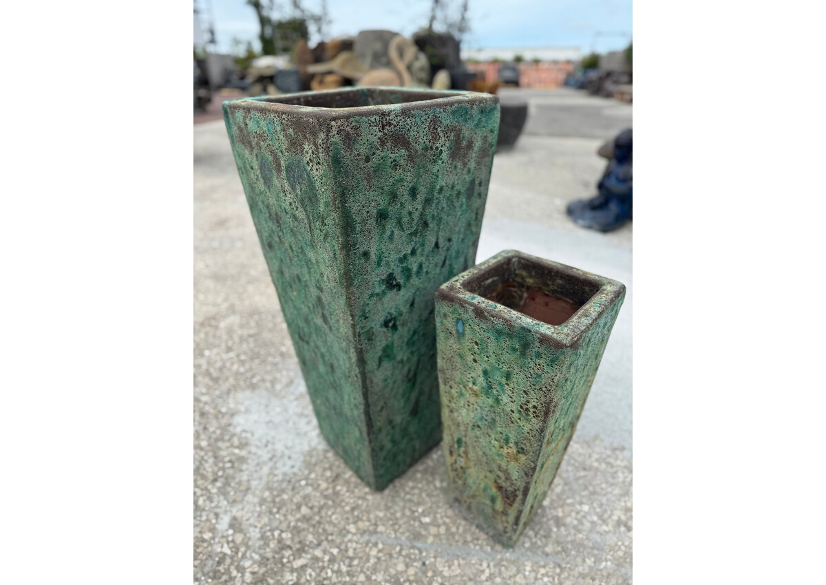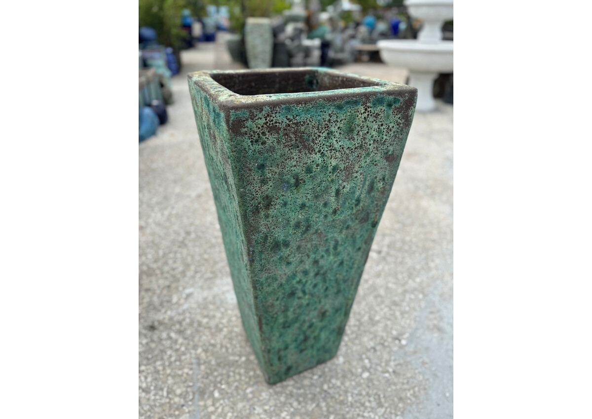 These Sleek Tall tapered squares make a beautiful statement in any entryway. Glazed in Boiling Green. 36H 15W 150 lbs