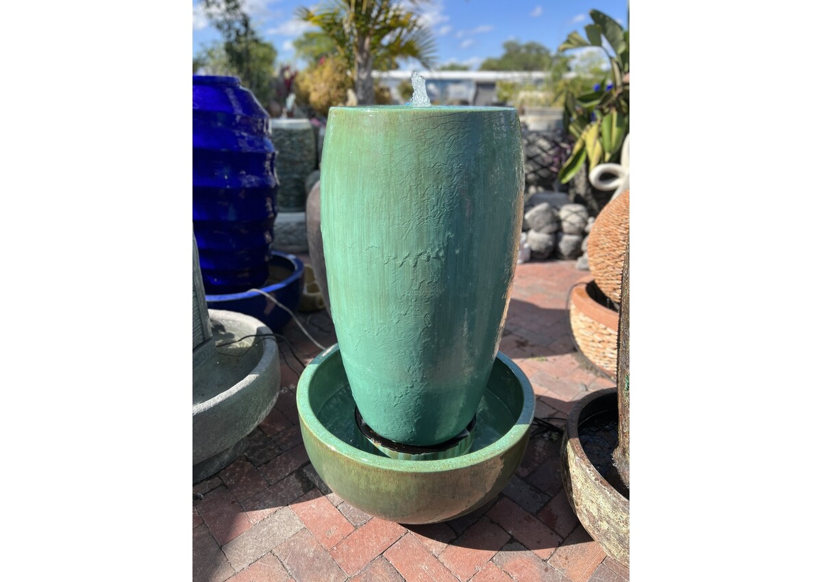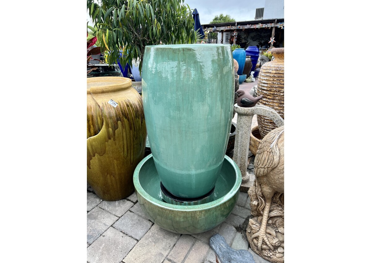 Beautiful glazed drum fountain with matching bowl. 45 H 26 W 350 lbs