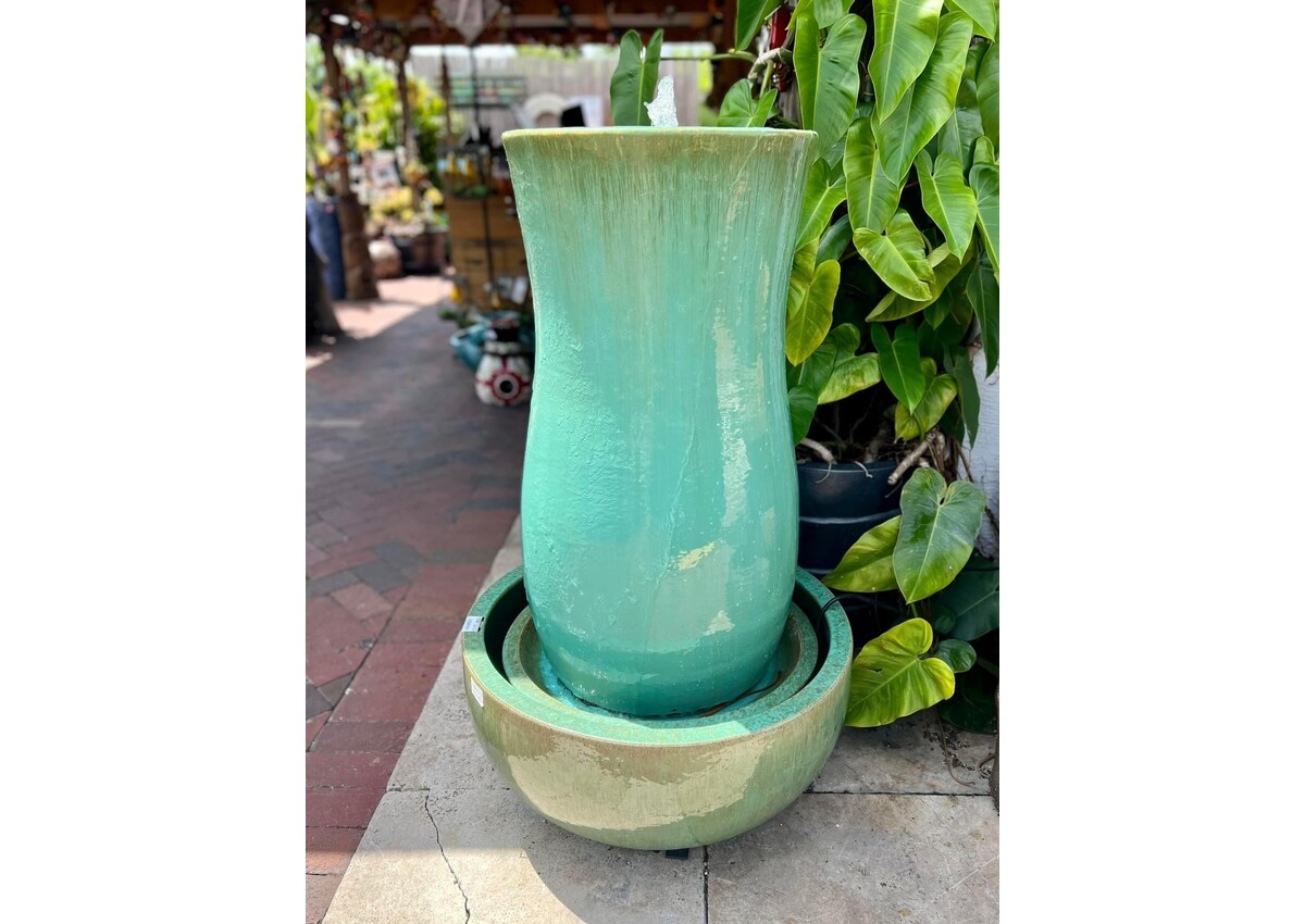 Beautiful glazed Hourglass shape fountain with matching bowl. 45H 26W 400lbs