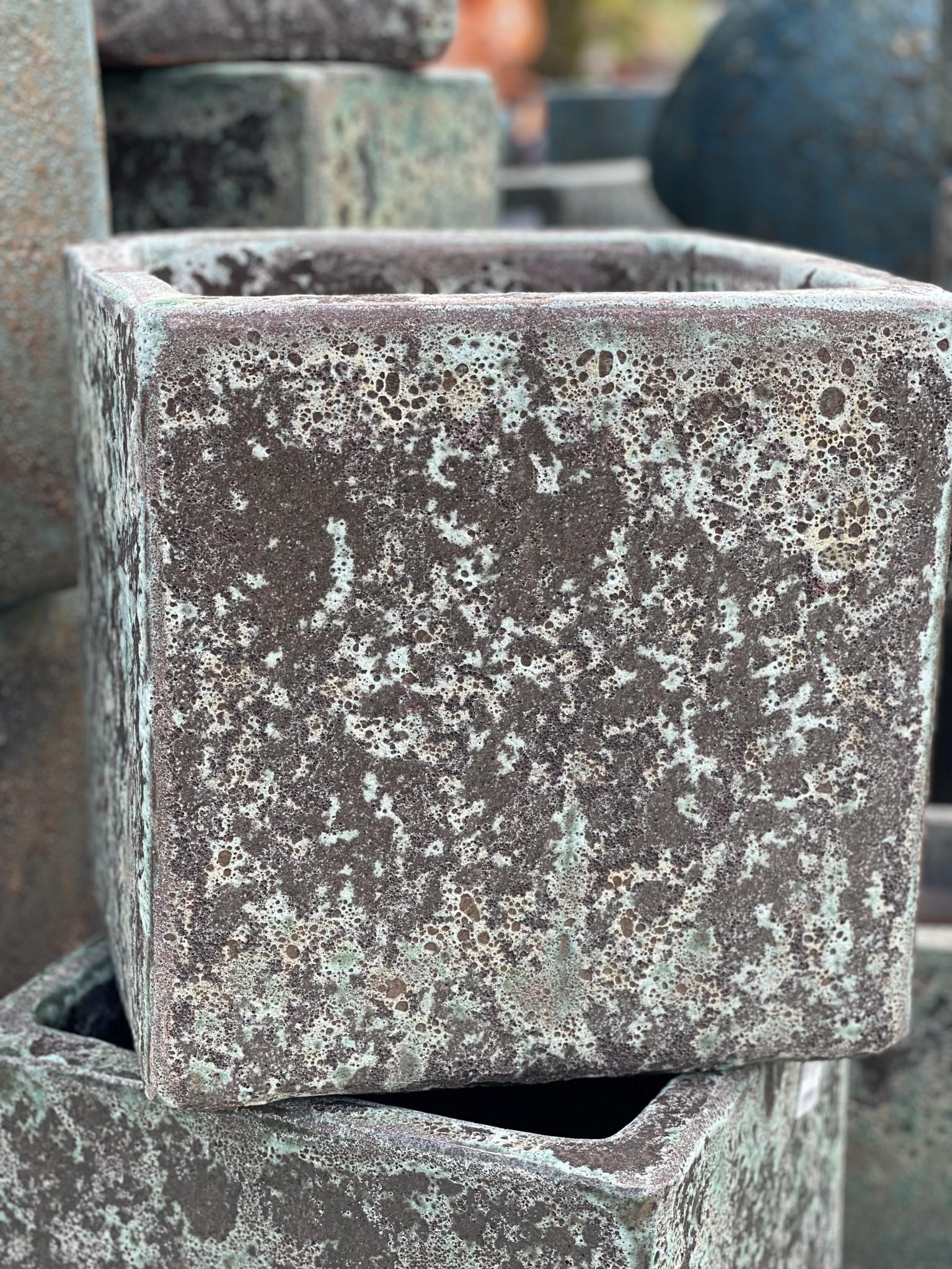 Unique square shaped planters with rounded corners. Glazed in Boiling Green. 13.5H 14W 55lbs