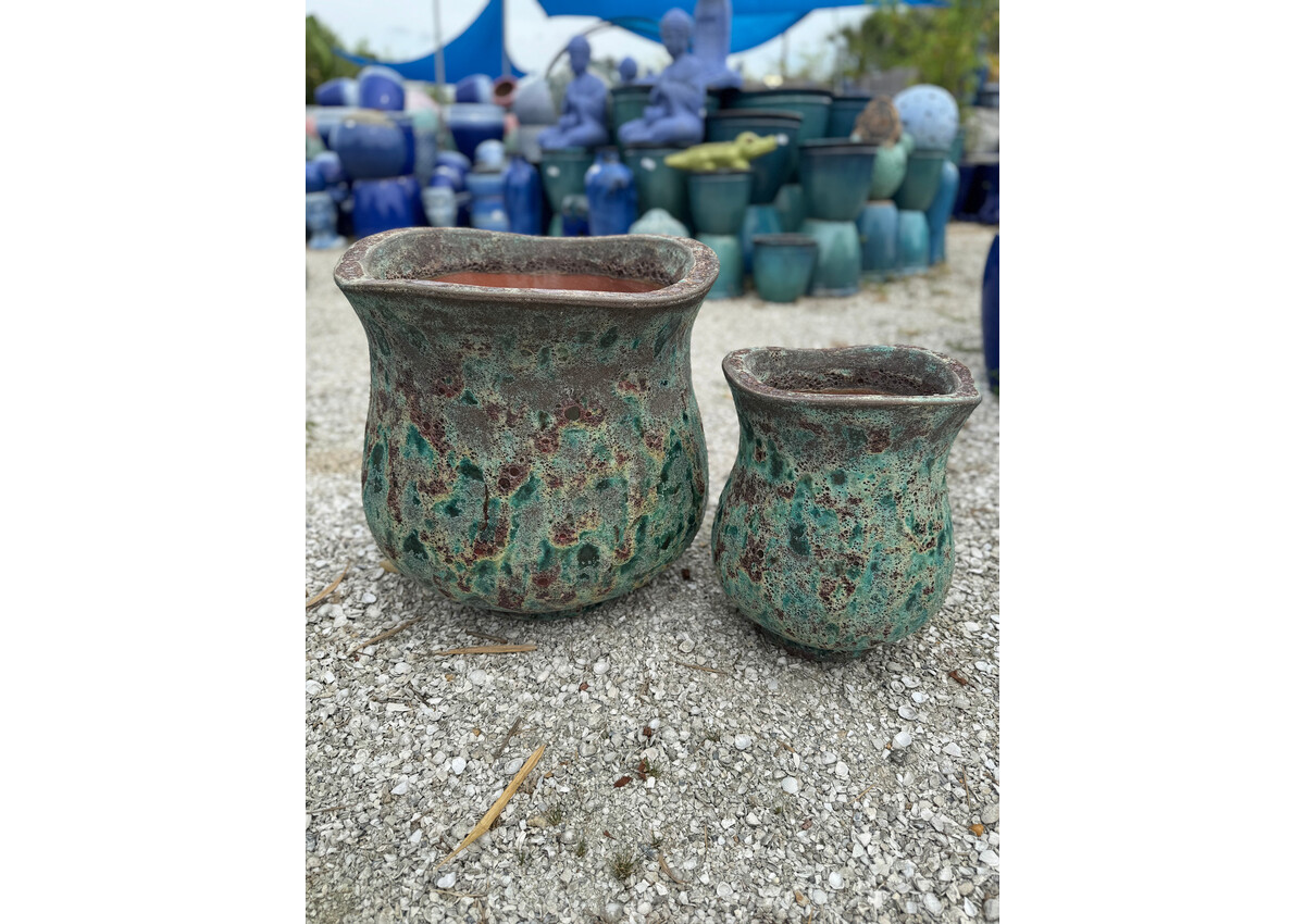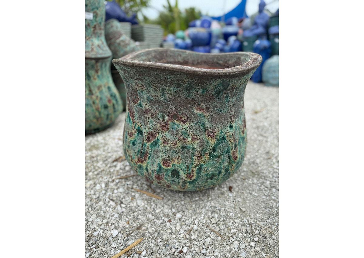 Unique bell shaped planter with a wave style rim. Glazed in Boiling Green. 19H 19W 85 LBS