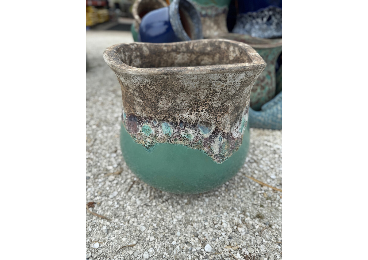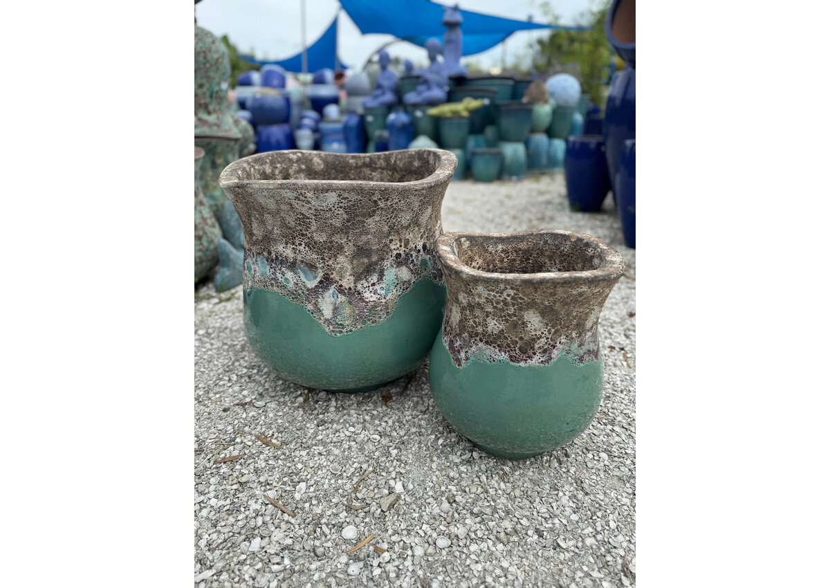 Unique bell shaped planter with a wave style rim. Glazed in Lava on Aqua. 19H 19W 85 LBS