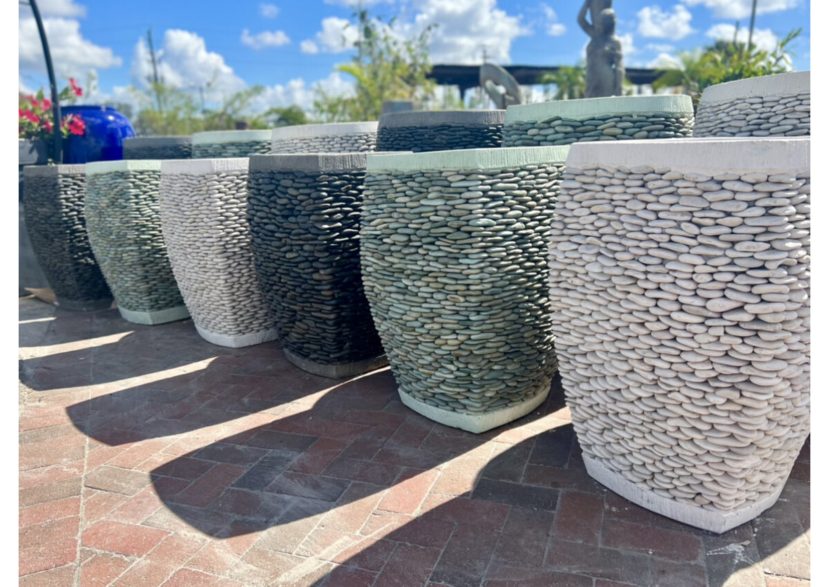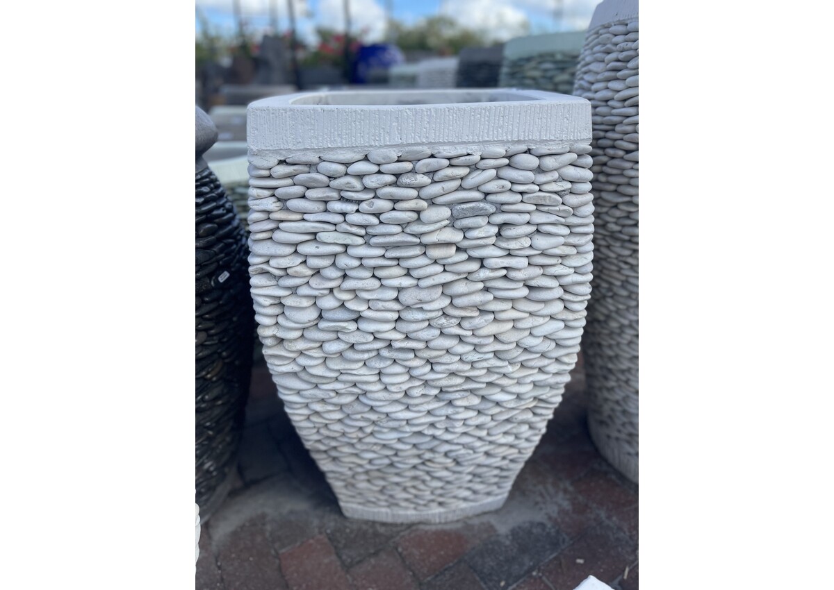 Pebble square planters with rounded edges and a tapered base. Concrete rim with White colored hand placed stones. 30.5H 20W