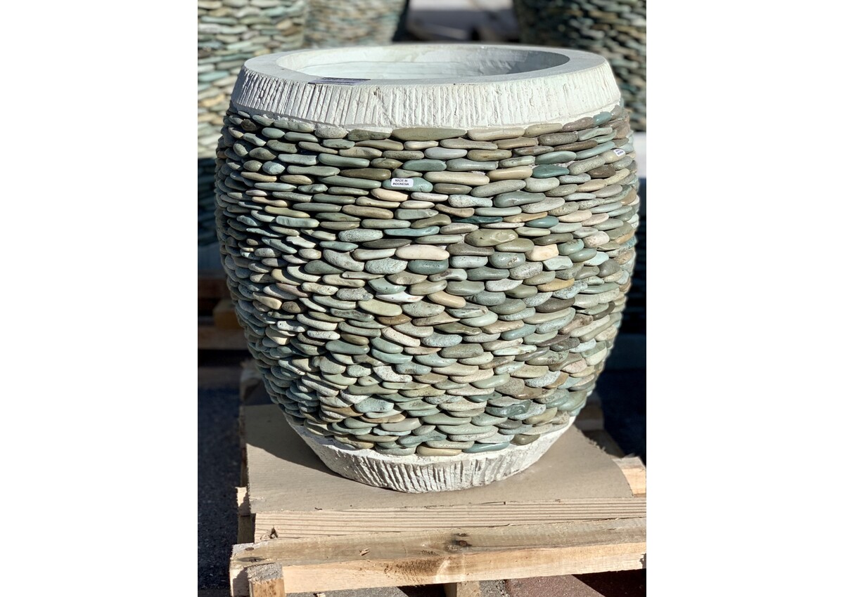 Beautifully handmade stacked pebble stone planter. An exquisite piece to any landscape design. Standing 18 inches high by 16 inches wide. 150 LBS