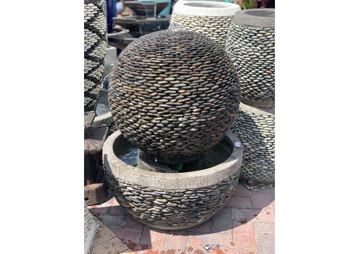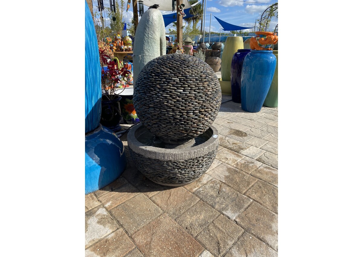 Beautifully handmade stacked pebble stone sphere water feature. An exquisite piece to any landscape design. Standing at 34 inches high by 26 inches wide. Each stone is placed and chosen to fit perfectly stacked upon one another. 550 Lbs
