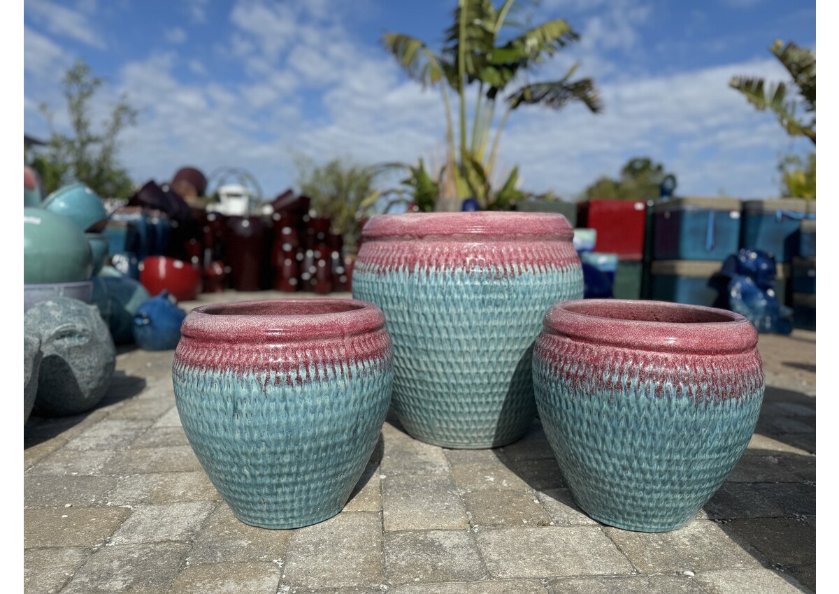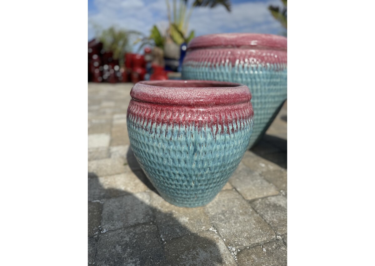Round Tapered Planter With A Dimple Design. Glazed in White Red on Milky Blue. 17.5H 17.5W 60 LBS
