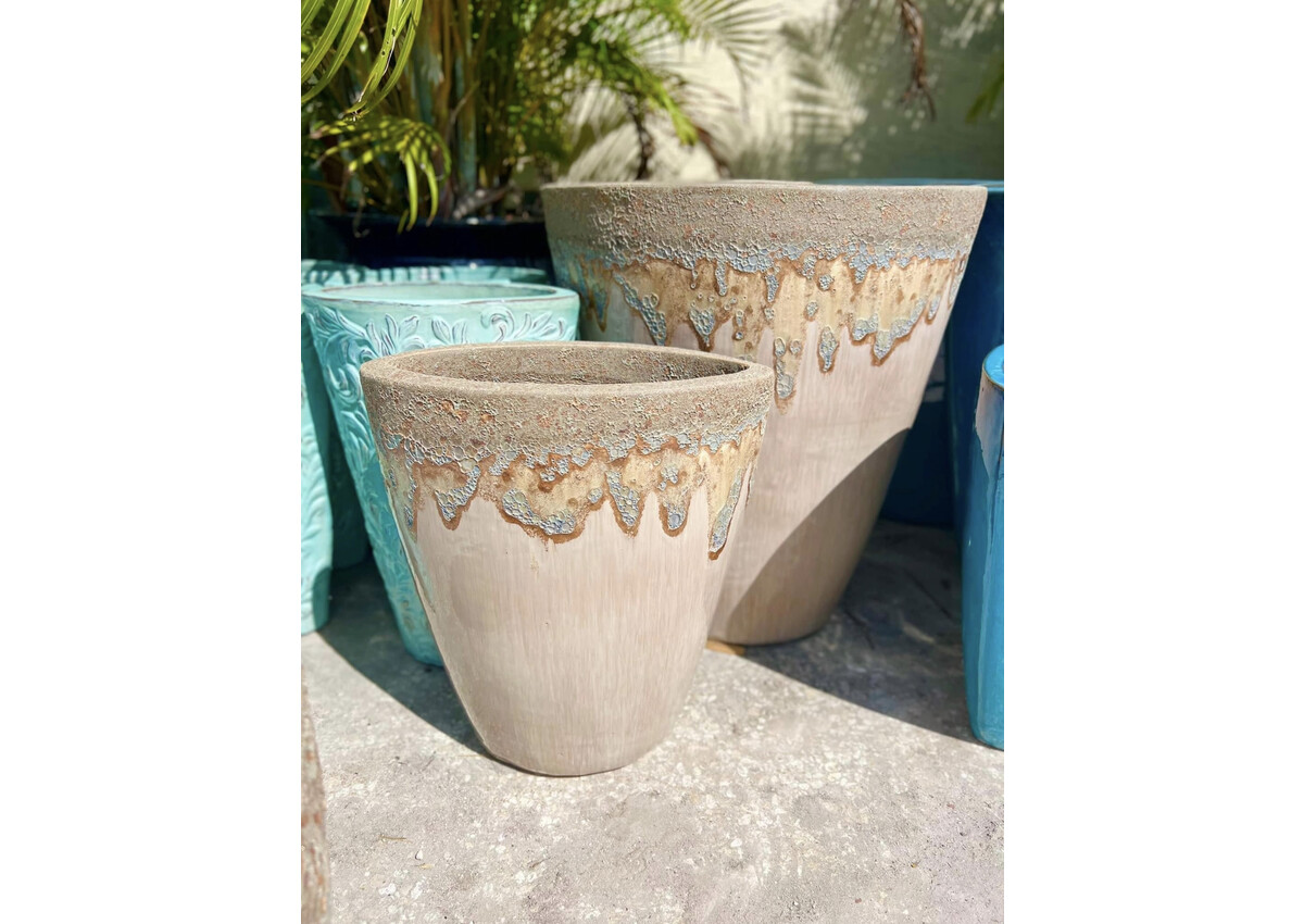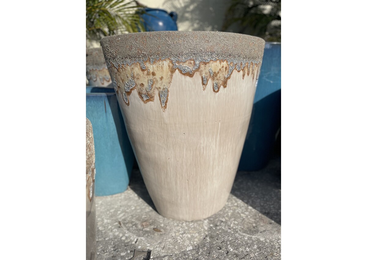 High-fired clay high oval pottery planter. Glazed in a Volcanic glaze over Desert Blue. Perfect for an entry way, tight spaces or against a wall. 32H 28W 120lbs