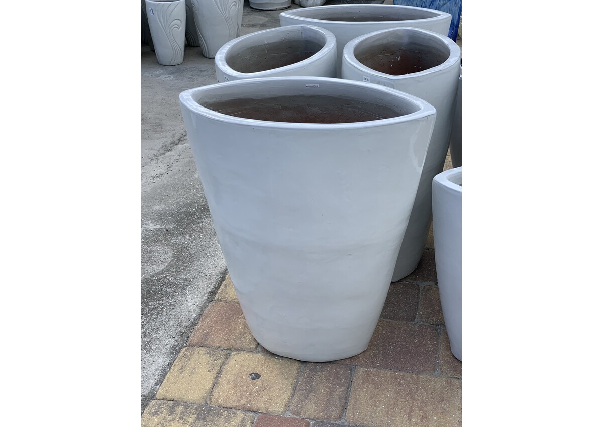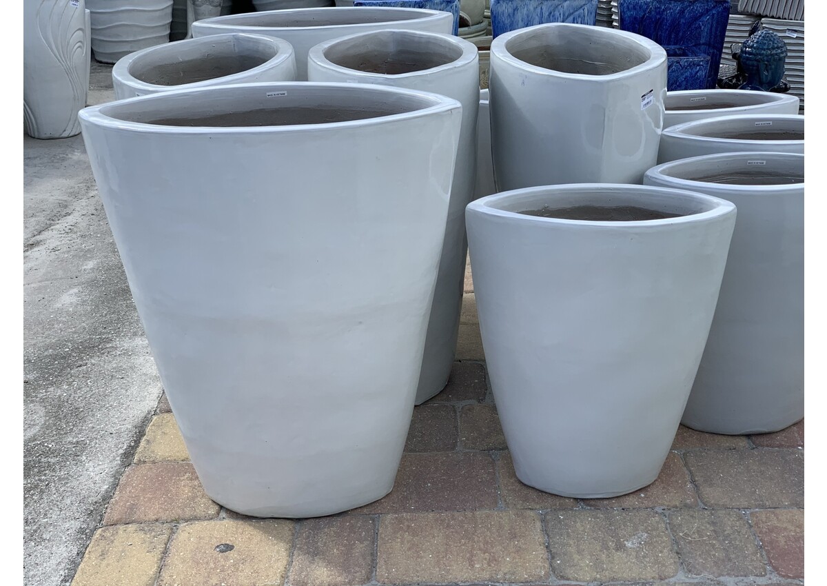 High-fired clay high oval pottery planter. Glazed in a sleek White. 32H 28W 120lbs