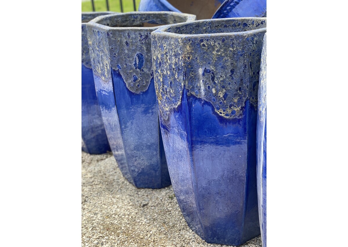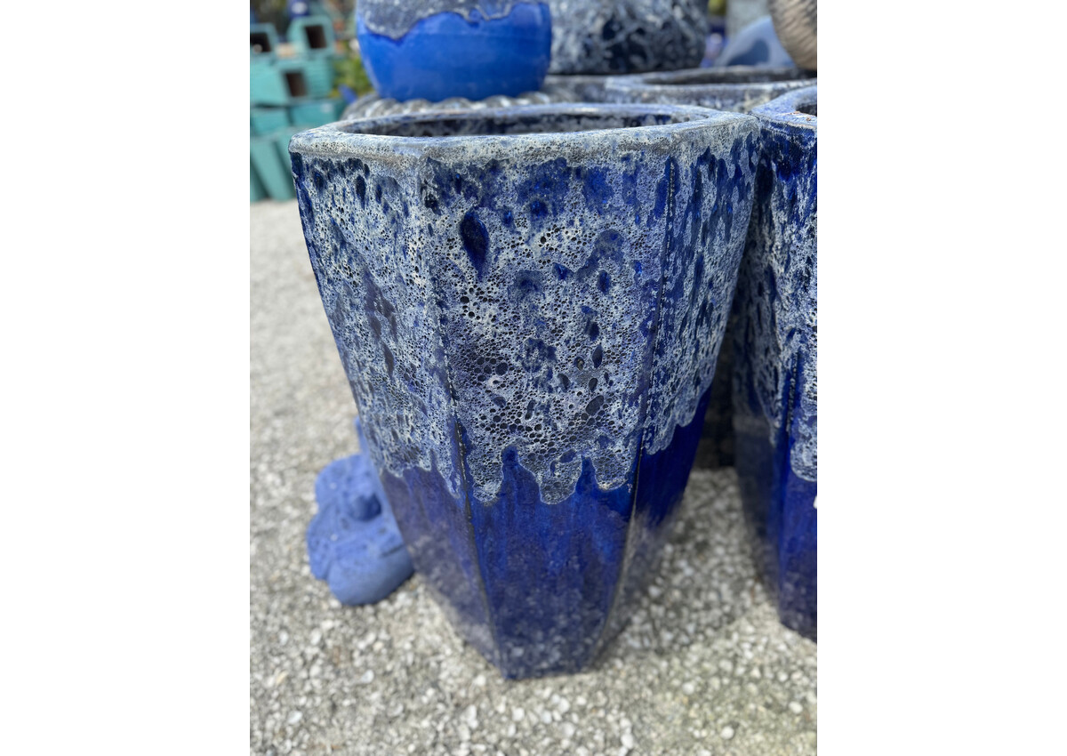 Tall octagon shaped planter with a dripping lava rim. Glazed in Boiling blue over cobalt. 36H 20W 150 lbs