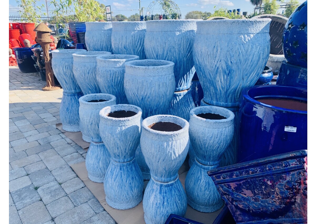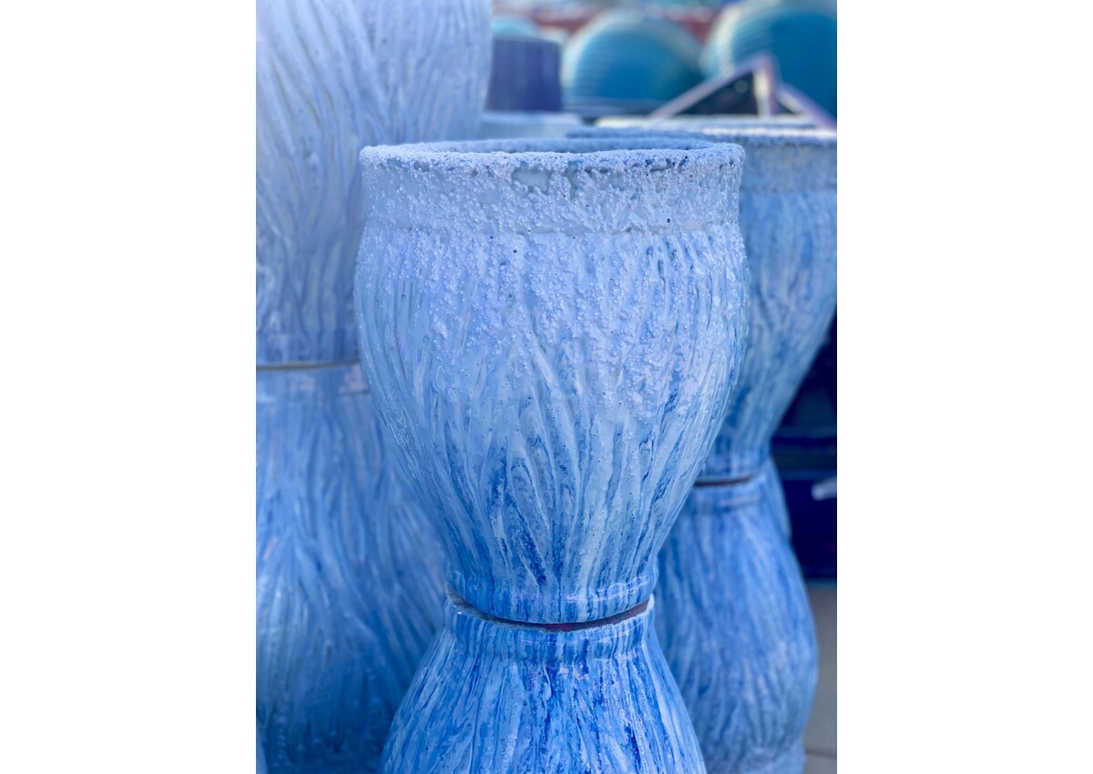 High-fired pottery planter glazed with a Sandy White glaze over a Falling blue with a hint of white. The Pisa planter has a feather like texture. The Sandy Falling Blue Pisa Planter is a perfect choice for your landscape or around your pool.