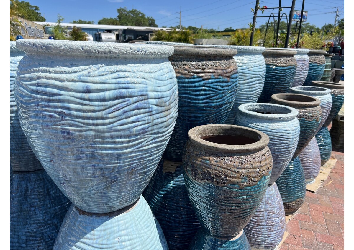 Round tapered planter with rim. Beautiful horizontal grooved pattern. Glazed in Sandy over Nature Cream. 26H 22W 95Lbs