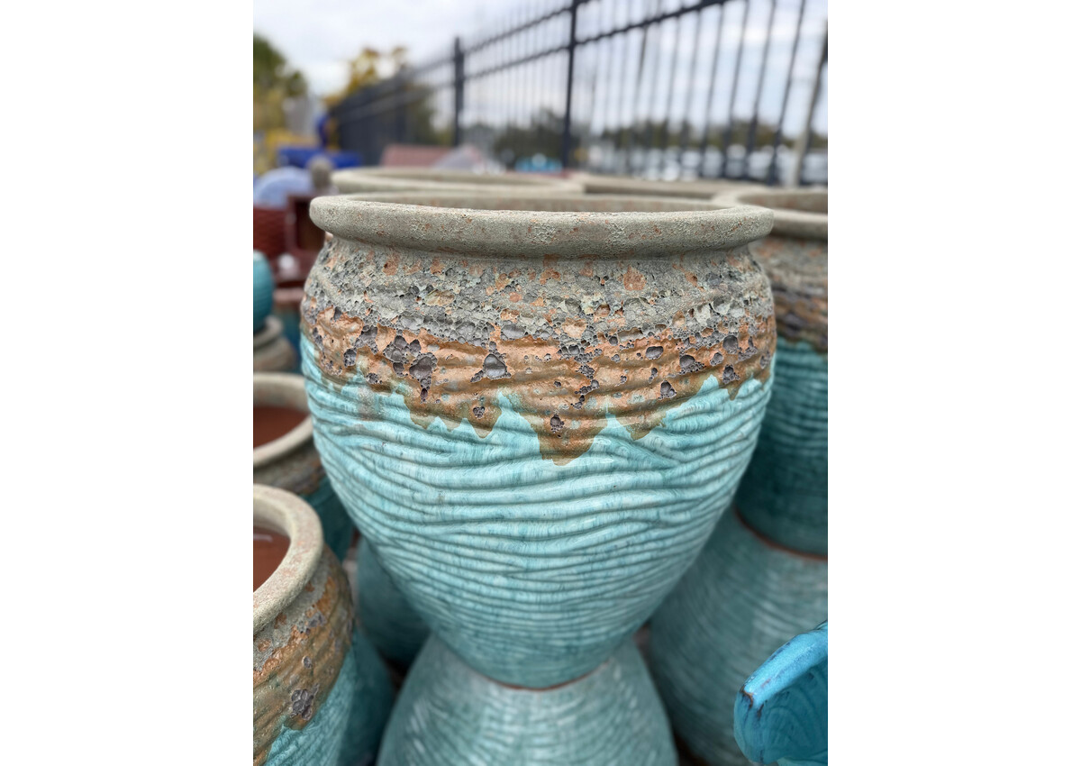 Round tapered planter with rim. Beautiful horizontal grooved pattern. Glazed in Volcanic over Milky Blue. 26H 22W 95Lbs