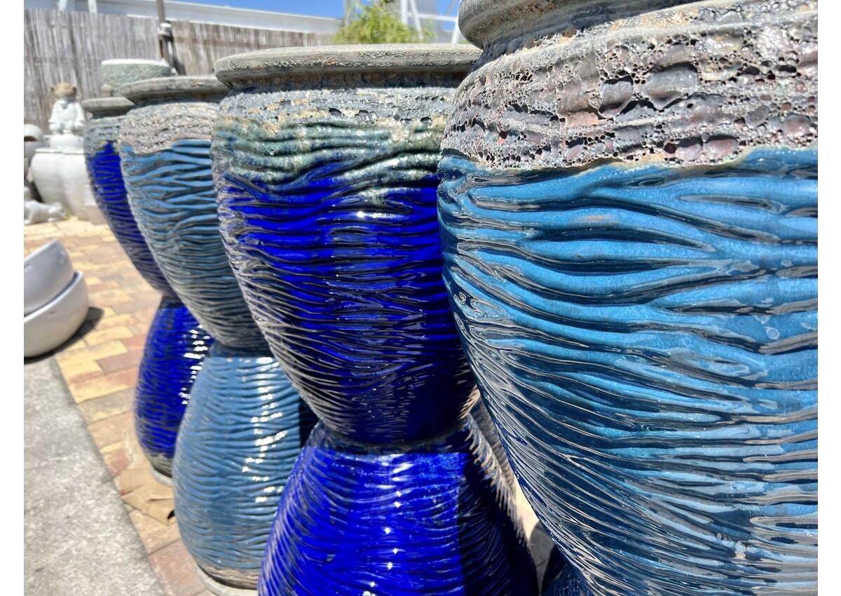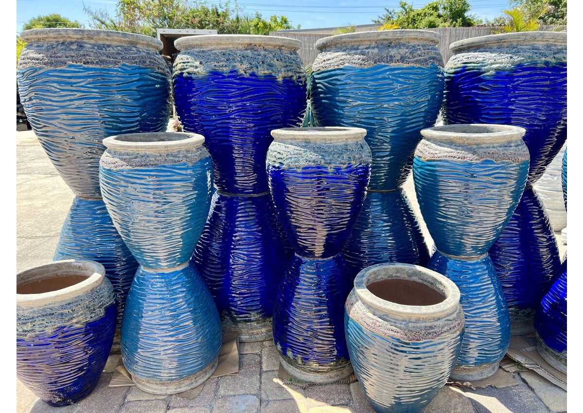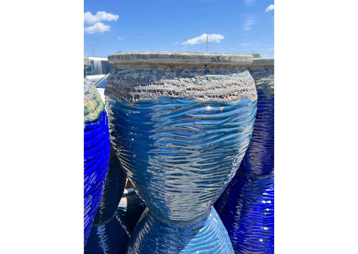 Round tapered planter with rim. Beautiful horizontal grooved pattern. Glazed in Volcanic on Ultramarine. 26H 22W 95Lbs
