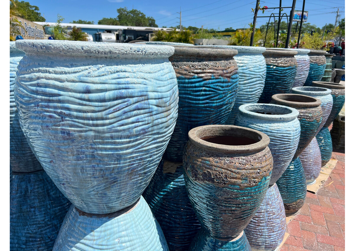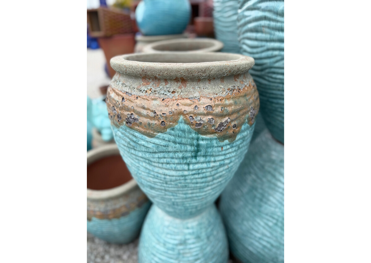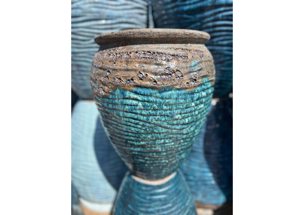 Round tapered planter with rim. Beautiful horizontal grooved pattern. Glazed in Volcanic over Milky Blue. 26H 22W 45Lbs