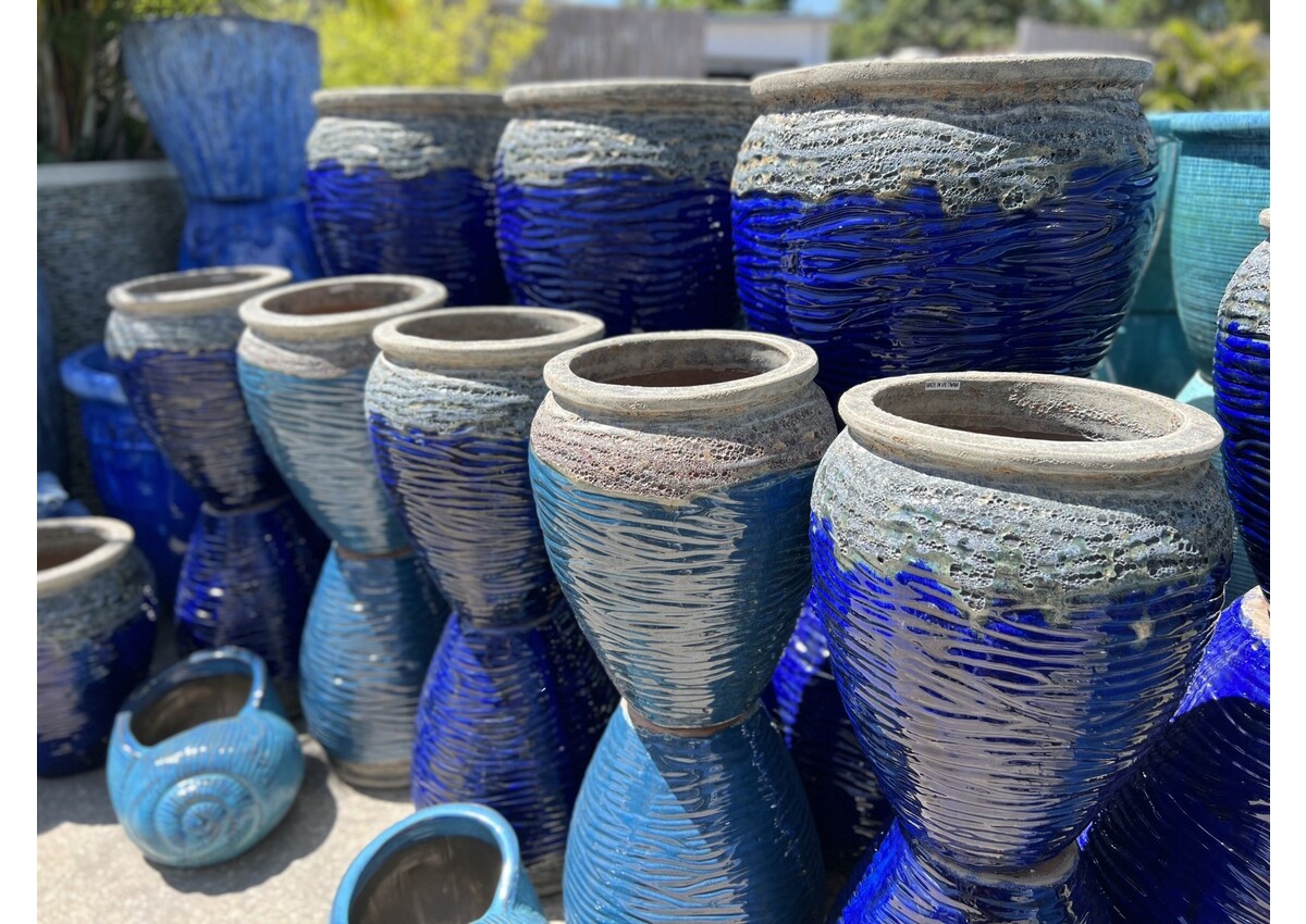 Round tapered planter with rim. Beautiful horizontal grooved pattern. Glazed in Volcanic over Ultramarine. 26H 22W 45Lbs