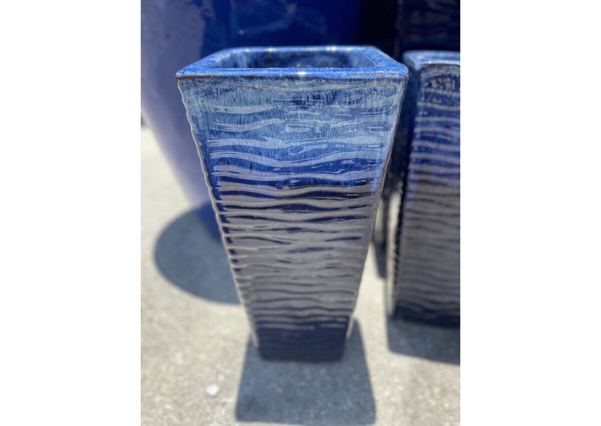 These Sleek Tall tapered squares make a beautiful statement in any entryway. Glazed in a unique Falling Blue on Light Blue. 18.5H 8W 25 lbs