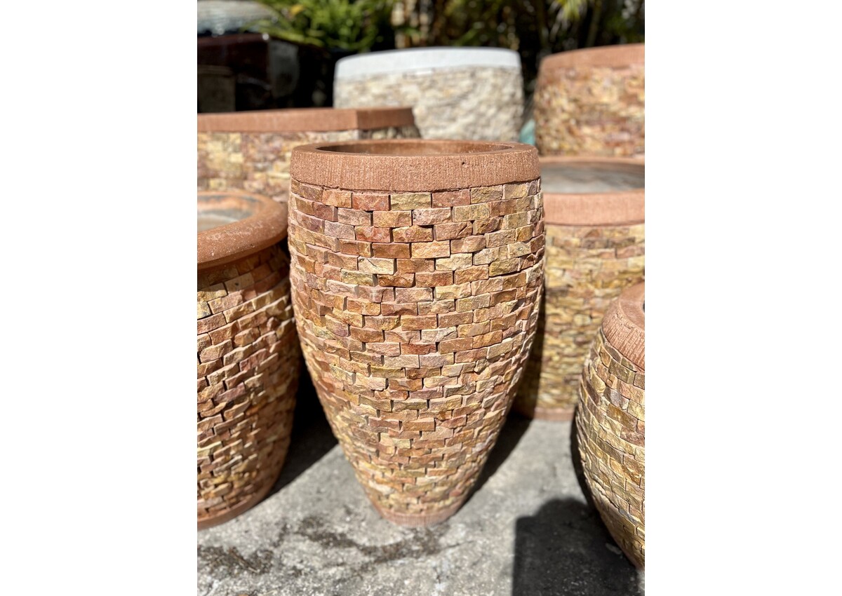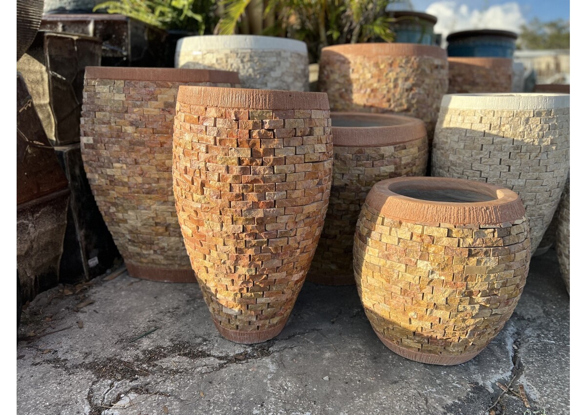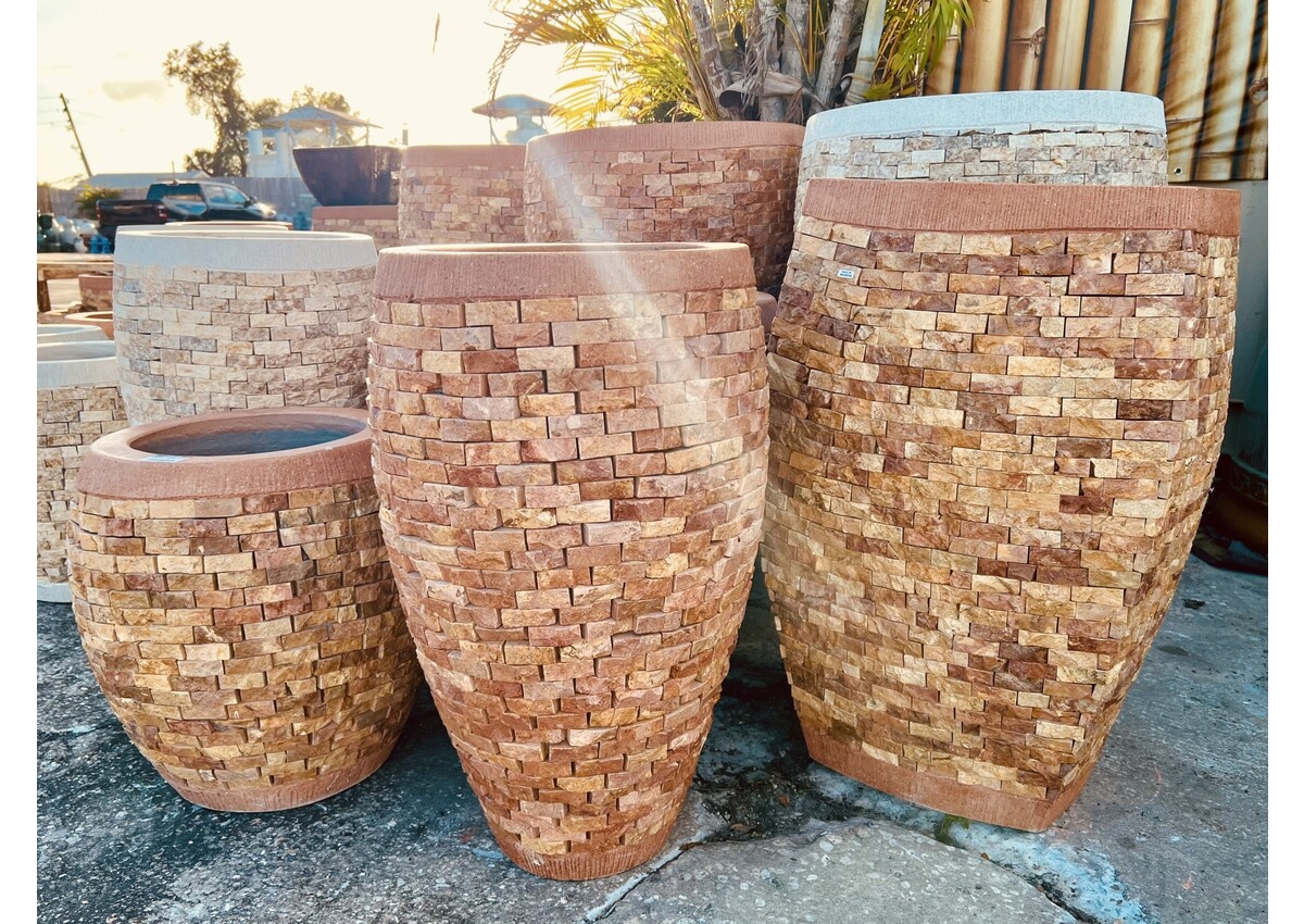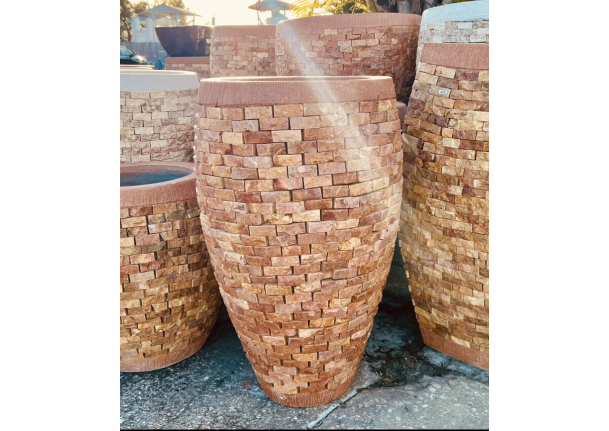 Handmade stacked pebble stone round planter with rose stones. A unique addition to your lanai or landscape design. A show stopper piece. Standing 28 inches high by 16.5 inches wide. 225lbs