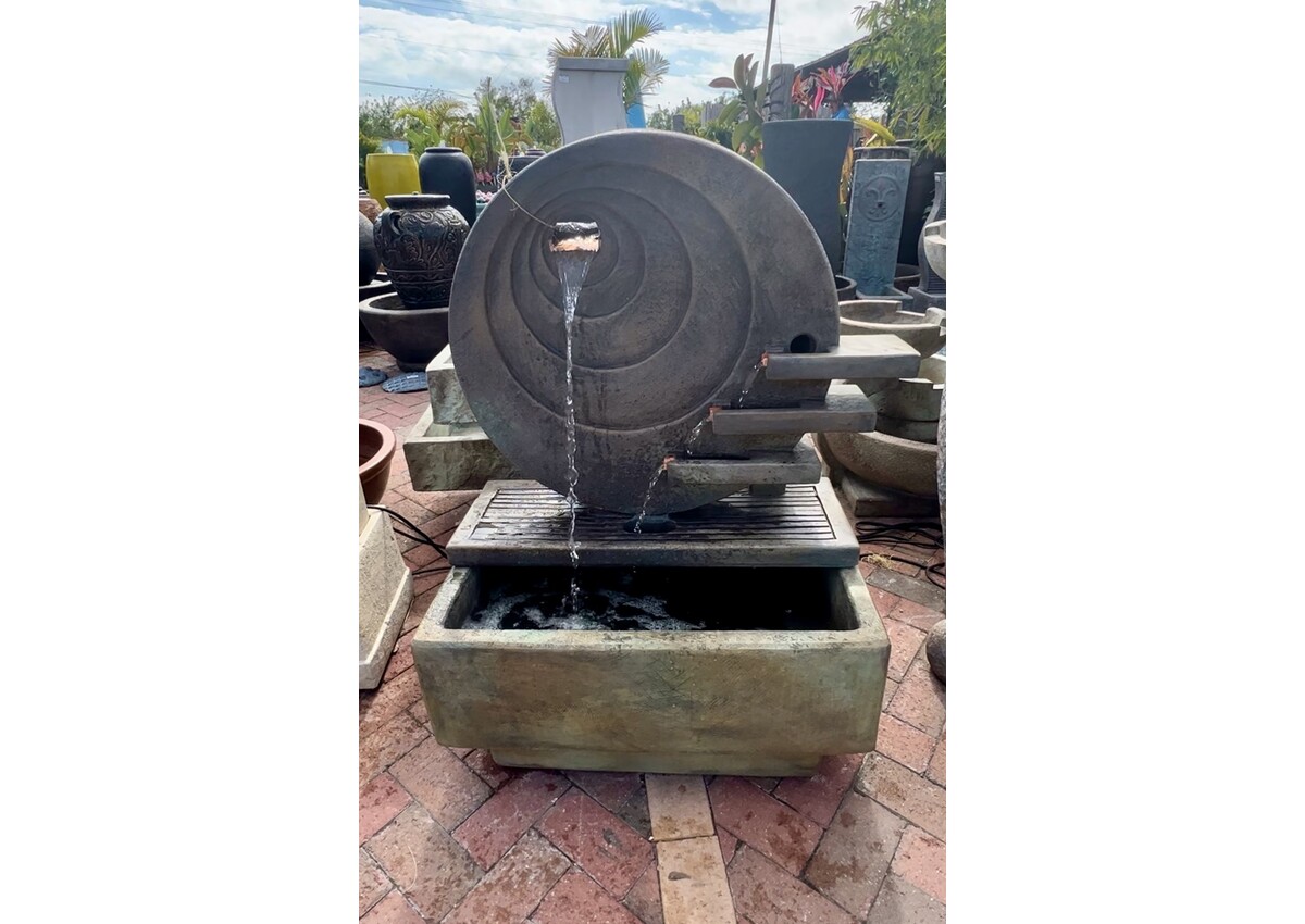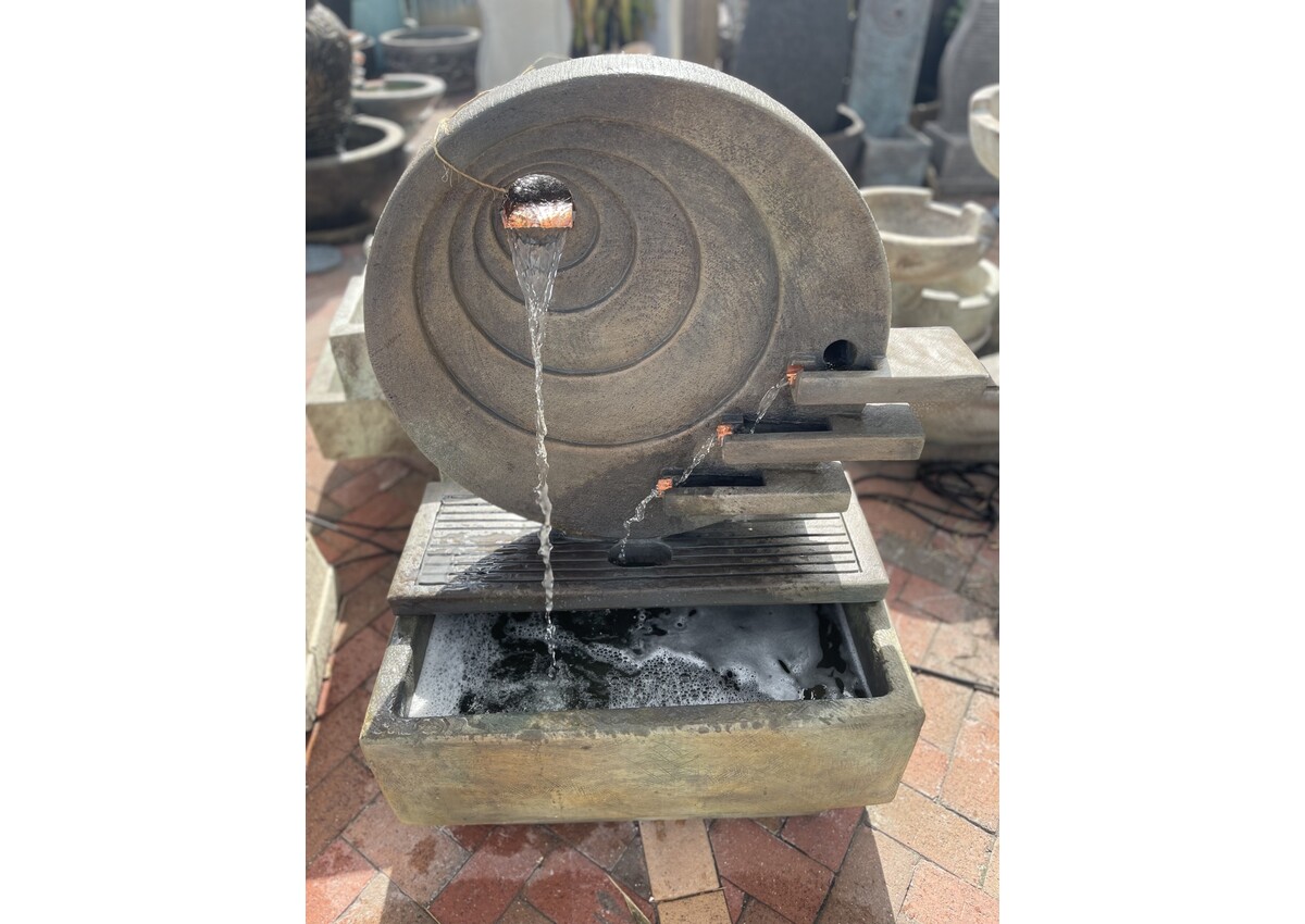Unique fountain with a round top. This fountain has two waterfall locations. One on the upper left, spouting out of the hole in the fountain, and the second on the right, sending water cascading down the steps. 40H 29 W 330 LBS