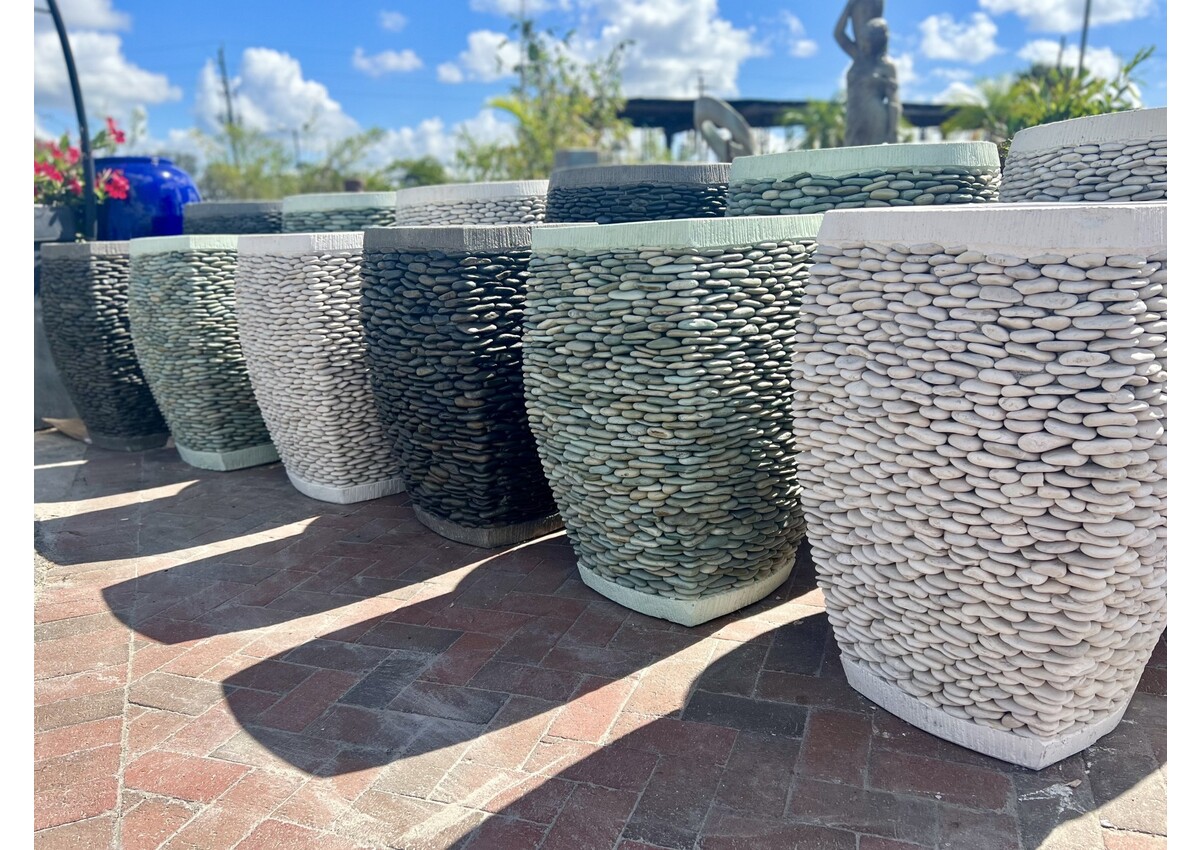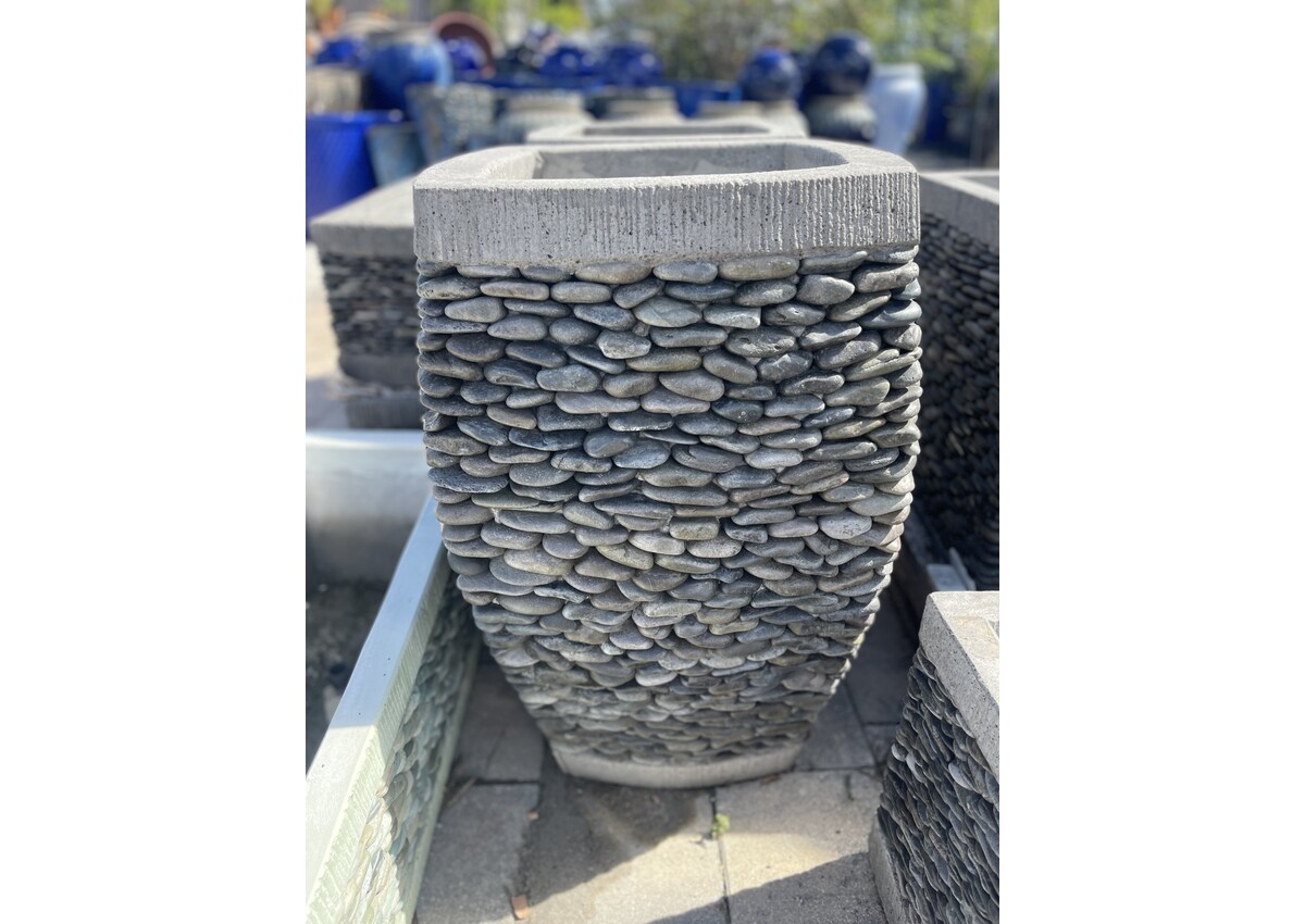 Pebble square planters with rounded edges and a tapered base. Concrete rim with Natural colored hand placed stones. 30.5H 20W