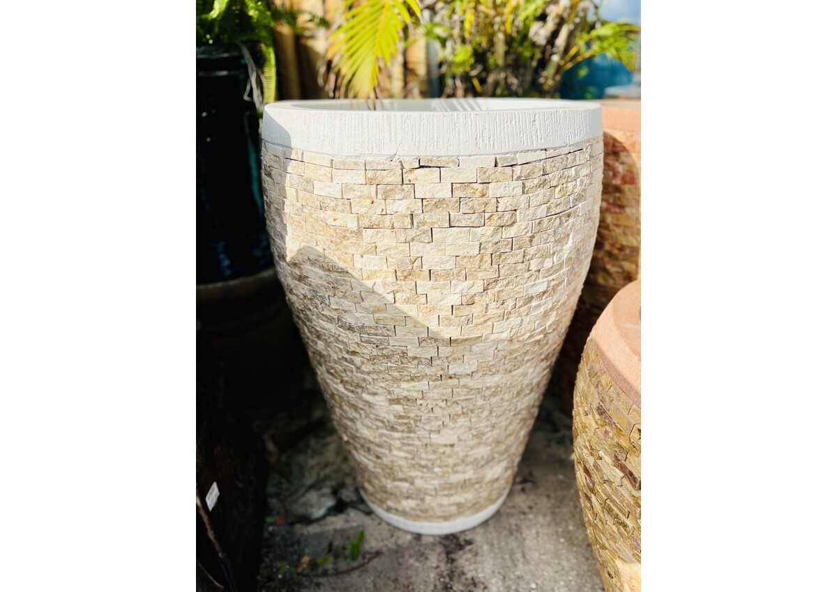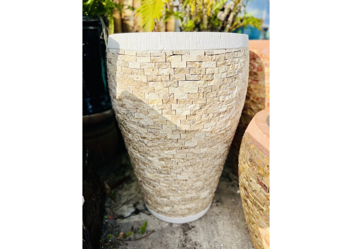 Handmade stacked slate stone round planter with white stones. A unique addition to your lanai or landscape design. A show stopper piece. Standing 36 inches high by 24 inches wide. 350 lbs